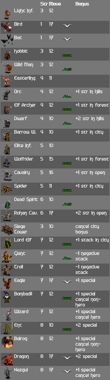 You use various military units to achieve this goal. You can stack up to 8 of them in a single square. A large part of winning Warlords X is combining units efficiently (terrain bonus will make the whole stack move faster through e.g. forest, while a military bonus helps in battles). Hopefully your armies will be able to conquer cities that can in turn produce more armies. How to read the table below is explained here.